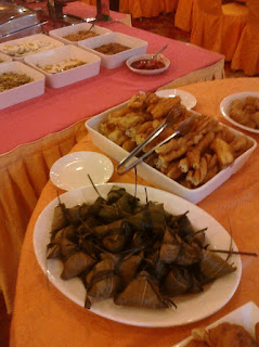 This was at the hotel in china that I stayed at one night. The green little tied up 'packages' are sticky rice wrapped in bamboo. It is served at this time of year because of the dragon boat festival. I am not a very big fan of the strange flavor and even texture of the very sticky rice that seems to grow and be never ending when you're given it as a special treat and eating it trying to be nice. I was happy this was on a buffet and went right on by :)...but then I got to the end of the buffet and realized I hadn't picked anything!! It was not your typical american breakfast. My friend thougt I was funny for being so shocked at all of the noodles and vegetables...and all of the wait staff was watching me and smiling. I finally found some watermelon...donut holes (which I thought were donut holes and very much wer Not), bread and then I got some rice porage that I put sugar in (the sugar was not for the rice porage but was put out for the tea). My friend said that everyone was probably watching what I picked thinking 'what a strange combination and strange choices!' haha :) there were not many people in the room but it sounded like there were with all of the slurping and eating noises that are not considered rude in China.